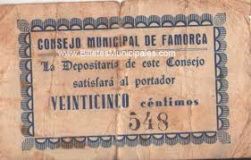 En 1937 se imprimió papel moneda municipal en Famorca. Se hicieron dos clases de billetes, de veinticinco céntimos y de una peseta. También se fabricó papel moneda en Fageca, Quatretondeta, Balones, Benimassot y Gorga.