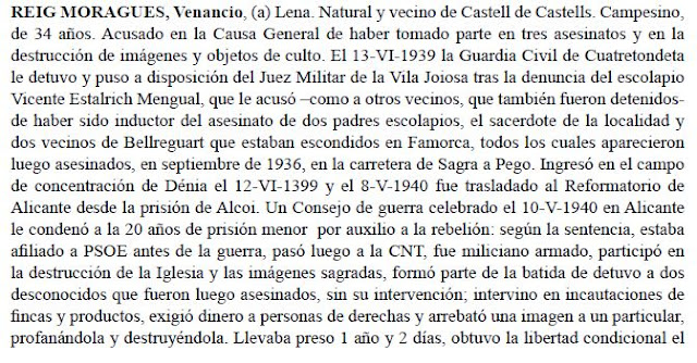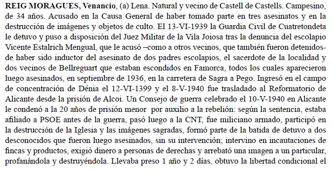 Natural y vecino de Famorca. Campesino, de 19 años. Ingresó en el campo de concentración de Dénia el 4-VI-1939 y el 10-I-1940 salió en libertad condicional. Según un informe de la Guardia Civil de 25-VIII-1950, durante el dominio rojo se afilió a la UGT, en la que ocupó cargos directivos, fue miliciano armado, intervino en la destrucción de la Iglesia y en “exacciones en metálico a personas de derechas”. Se incorporó después al ejército rojo por su reemplazo “y a la Liberación fue detenido y absuelto”. Sin embargo, y según la Causa General, estuvo encarcelado durante algún tiempo en Villajoyosa y Denia, tras haber sido “en su debido tiempo denunciado a la Guardia Civil como copartícipe en los hechos delictivos ocurridos en esta localidad durante la dominación marxista” (Fuente: Causa General – AHPA. Legajos 937 y 12618).