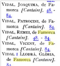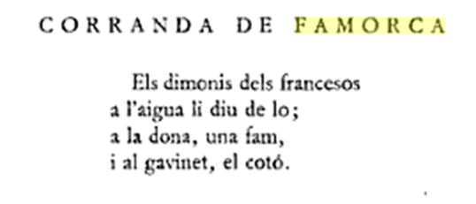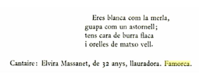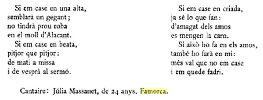 Hay un libro imprescindible, publicado por Salvador Seguí y que se llama “Cancionero Musical de la provincia de Alicante”, y que está publicado en 1973 por la Diputación Provincial. Ahí vienen canciones de muchos lugares de la provincia, pero no vienen todos los pueblos, ni mucho menos, lo cual hace que todavía sea más interesante la recopilación que se hizo en Famorca. Se recogen diecisiete canciones específicas que se cantaban en Famorca. (La recopilación se hizo en 1973, y los informadores fueron: Consuelo Vidal Vidal, Cándida Masanet Mas, María Masanet Mas, Amparo Masanet Santacreu, Francisca Masanet Segura, José Vicente Ruiz Masanet, José Vidal Ferrándiz y Jose A. Masanet Masanet).