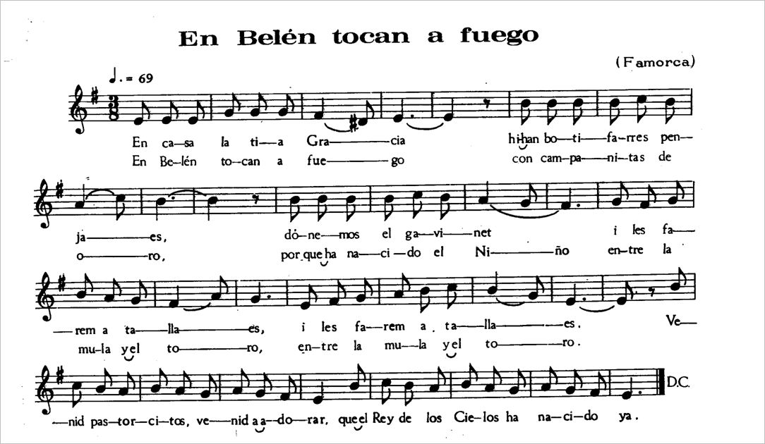 -El villancico de “En Belén tocan a fuego” la cito también en Villancicos: “En casa la tía Gracia hi ha botifarrres penjaes..” y también el de “En goig i alegría”