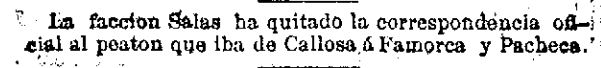“A la vista de Castell se halla una partida carlista de 30 hombres y que la facción Salas ha quitado la correspondencia oficial al peatón que iba de Callosa a Famorca y Facheca”.