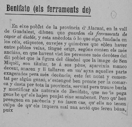 «Las herramientas de Benifato.Cuenta que en Benifato guardan las herramientas de capar al diablo ya que “según cuentan los más ancianos, habiendo visto las personas más devotas de dicho pueblo que la figura del demonio que la imagen de San Miguel, su titular, tiene a sus pies, parecía poco decente, fueron y con un hacha le cortaron las partes más exageradas, para que estuviera más decente”