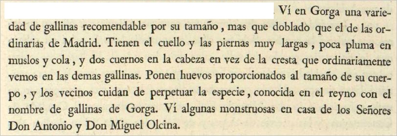«Gallos de Gorga. Son una notabilidad y se pagan a precios muy subidos. En la Exposición Regional de Valencia, de 1867, se concedió un premio, medalla de bronce, a D. Casto Vargas que presentó dos ejemplares. Tienen muy largas las piernas y negras todas sus plumas, sin mancha ninguna de otro color, y dos cuernos en vez de cresta. Se ha descuidado mucho la cría y conservación de estos animales y hoy casi no quedan ejemplares».