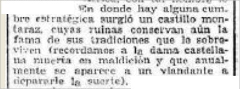 “En donde hay alguna cumbre estratégica surge un castillo montaraz, cuyas ruinas conservan aún la fama de sus tradiciones que lo sobreviven (recordamos a la dama castellana muerta en maldición y que anualmente se aparece a un viandante a depararle la suerte)”.