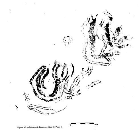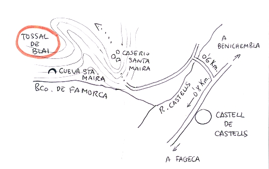 ZA-89-AR En las dos vertientes del barranco existen abrigos, pero sólo hay pinturas en la vertiente izquierda.“En un Estudio de los mismos autores, publicado en 1995, en la revista Alberri, del Centre d´Estudis Contestans (CENTRE D´ESTUDIS CONTESTANS. “Alberri. Nº 4”. Centre d´Estudis Contestans. Cocentaina. 1995) se citan las pinturas del Barranc de les Salemes en Fageca: «Se encuentra a la izquierda del camino de les Salemes (yendo desde Fageca a Benimassot), justo antes de que el camino gire bruscamente hacia el norte. Se trata de tres pequeños abrigos unidos por una misma cornisa, en la margen derecha del barranco, a unos 10 metros sobre el cauce. El abrigo mide 14 metros de largo y su profundidad máxima es de 1,50 metros. Apenas se aprecian unas pequeñas barras, de menos de 10 centímetros de longitud, y restos de un posible sol donde aún se aprecia alguno de los rayos».