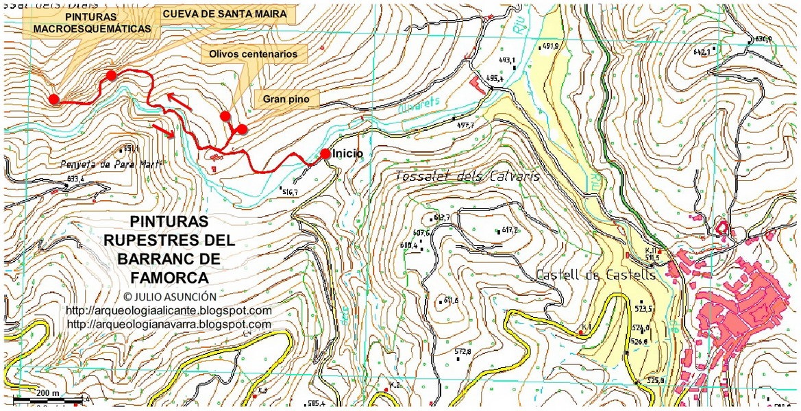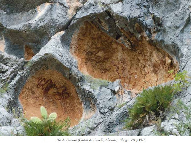 El libro “El arte rupestre en Alicante” describe las pinturas del Racó de Gorgori, Barranc de Bitla, Cova Alta, Esbardal de Miquel el Serril, Racó de Sorellets, Barranc del Galistero y Pla de Petracos, en Castell de Castells.