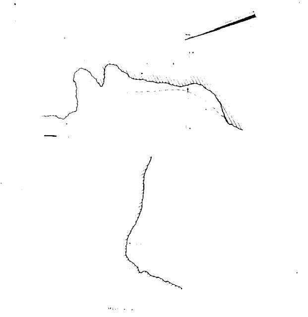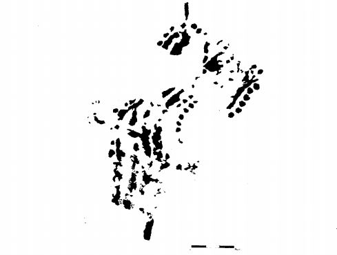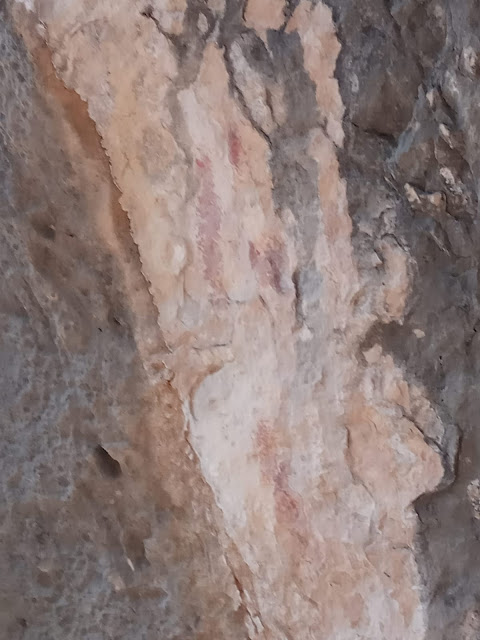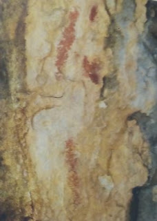 Pinturas: A 2m. sobre el suelo del escalón. Restos de un circuliforme alargado partido por un diámetro en el eje mayor o de tres barras verticales unidas por otra en el extremo inferior