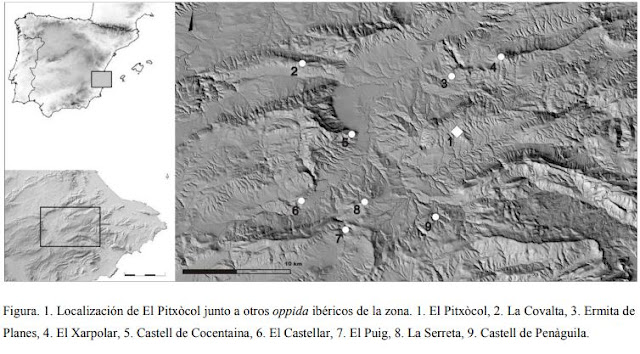 “Normalmente se elige como emplazamiento un espolón rocoso entre dos barrancos, lo que constituye una protección natural del poblado, y se cierra… con una recia muralla a veces de varios metros de grosor en la base, Sorprende y maravilla semejante obra de protección para aldeas cuyo número de casas es generalmente reducido. Aunque conocemos gran número de estos poblados –es un periodo de una intensísima densidad de población sin que sea posible determinar si se trata de poblados contemporáneos o sucesivos- apenas ninguno de ellos ha sido excavado en su integridad y la información de que se dispone sobre el aspecto urbanístico es muy deficiente”. (E. A. Llobregat Conesa, 1976)