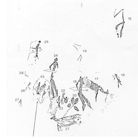En el extremo izquierdo del abrigo hay una pequeña figura en “Y”. A la derecha de la entrada hay dos motivos en “T”, uno encima de otro.