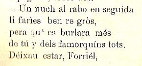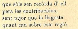 “–No prengues per un desprèci, Recordí, la satisfacció en que así baix vos traten desde´l més gich al major; això es degut al carácter que así tenim de guasóns, que de nosatros mateixos es burlèm en ocasións. Per lo de més, vos volém igual que volém a tots, desijantvos tant de bé com als més volguts de tots.– Em done per satisfet de la sehua esplicació, y dich dels burros del Vall que sou els més bòns de tots, puix no´s barallen com atres en tindre quatre rahons, sinó que al instant els pasa y s´apacigüen del tot; per això al govèrn demane més ajuda y protecció, pera no morirmos d´asco del mon en este racó.– Amén. Deu que t´escolte y á tots els de la reunió, y que milloren els temps pa que no siguen tan borts”