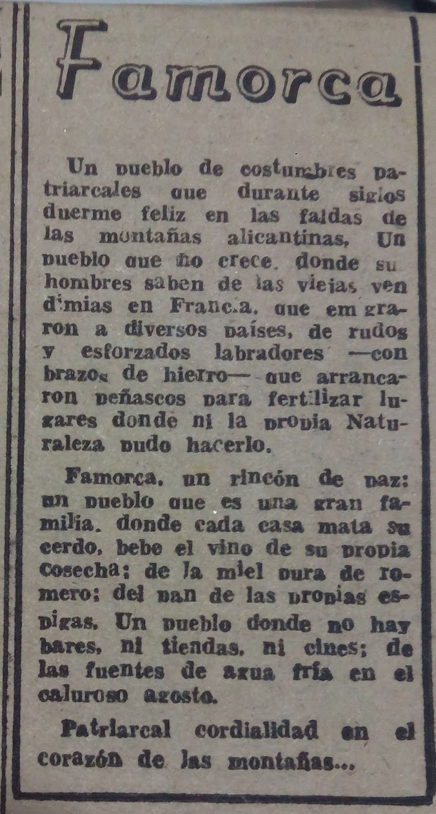 Famorca, un rincón de paz: un pueblo que es una gran familia, donde cada casa mata su cerdo, bebe el vino de su propia cosecha, de la miel pura de romero, del pan de se las propias espigas. Un pueblo donde no hay bares, ni tiendas, ni cines; de ls fuentes de agua fría en el caluroso agosto.