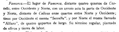 “Famorca: El lugar de Famorca, distante quatro quartos de Castells, entre Norte y Occidente, tiene por Occidente el monte de Serrella y por Norte el monte llamado Alfaro de quatro quartos de largo. Su término regular, plantado de olivos y tierra de labor (..) Facheca y Famorca, lugarcillos conjuntos, hacia el mediodía, distantes de Parcent tres leguas, situados entre dos montes, el uno hacia el Norte, que se intitula Sierra Mayra, hacia el Mediodía otro, que se llama Serrella, monte muy elevado, encima una casa de nieve, tiene a las paredes, cada uno, su fuente perenne. Tiene un barranco, que divide un lugarcillo de otro; su camino real para su entrada”.