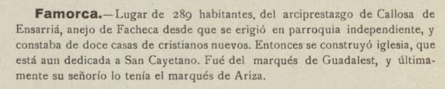 «Famorca: Lugar de 289 habitantes, del arciprestazgo de Callosa de Ensarriá, anejo de Facheca desde que se erigió en parroquia independiente, y constaba de doce casas de cristianos nuevos. Entonces se construyó la iglesia, que está aún dedicada a San Cayetano. Fue del Marqués de Guadalest y últimamente su señorío lo tenía el Marqués de Ariza