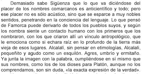 Demasiado sabe Sigüenza que lo que va diciéndose del placer de los nombres comarcanos es anticientífico y todo; pero ese placer no es sólo acústico, sino que se esparce a muy nobles sentidos, penetrando en la conciencia del lenguaje. Lo que pensó de Famorca puede derivarlo de todos los pueblos suyos, y según los nombra siente un contacto humano con los primeros que los nombraron, con los que criaron allí un vínculo antropológico, que le emociona como si echara raíz en lo profundo de la tierra más vieja de esos lugares. Alcalalí, sin pensar en etimologías, Alcalalí, pequeñito y agudo como un esquilón. Agres, umbrío y ermitaño. Ya junta la imagen con la palabra, cumpliéndose en sí mismo que sus nombres, como los de los dioses para Platón, aunque no los comprendamos, son sin duda, “la exacta expresión de la verdad”.