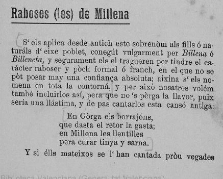 Les raboses de Millena :“Desde antiguo, se les aplica este sobrenombre a los hijos o naturales de este pueblo, conocido vulgarmente por Billena o Billeneta, y seguramente se lo sacaron por tener el carácter “zorrero” y poco formal o franco, en el que no se puede poner nunca una confianza absoluta; así se les nombra en toda la contornada, y por eso nosotros queremos también incluirlos aquí, para que no se pierda la simiente, pues sería una lástima, y de paso cantarles esta canción antigua: