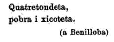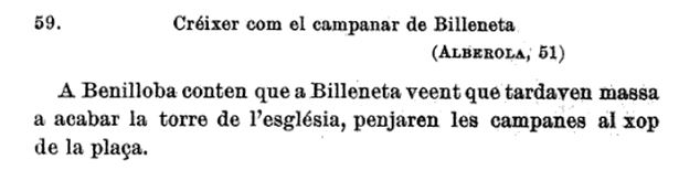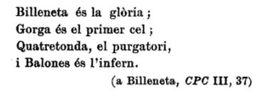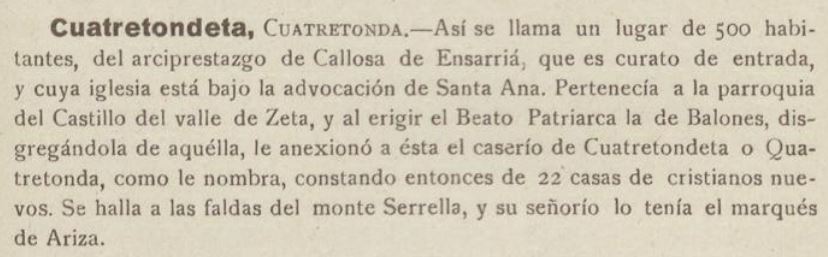 «Els espentadors de Quatretondeta:(Los empujadores de Quatretondeta). Casi todos los pueblos de nuestro reino están señalados por un nombre o sobrenombre que les caracteriza, y a esa especie de antigua costumbre obedece el que les apliquen a los naturales de este pueblecito de la provincia de Alicante, en el valle de Seta, a lo que se ve por el vicio, o lo que sea, que tienen de ponerse, unos a otros, las manos encima mientras hablan, de gastarse bromas y de empujarse o darse empujones; y como este modismo corre mucho por todo aquel contorno, hemos querido nosotros extenderlo más, por si se perdiera la simiente, y al mismo tiempo dedicarles esta copla:“En Balones son sarvajosen Gòrga tots son dotors,en Billena rabosetes,Quatretonda espentadors”.Y si no lo quieren, que lo tiren, que cada uno aguante su fusil cuando le toque: lo demás es aire”.